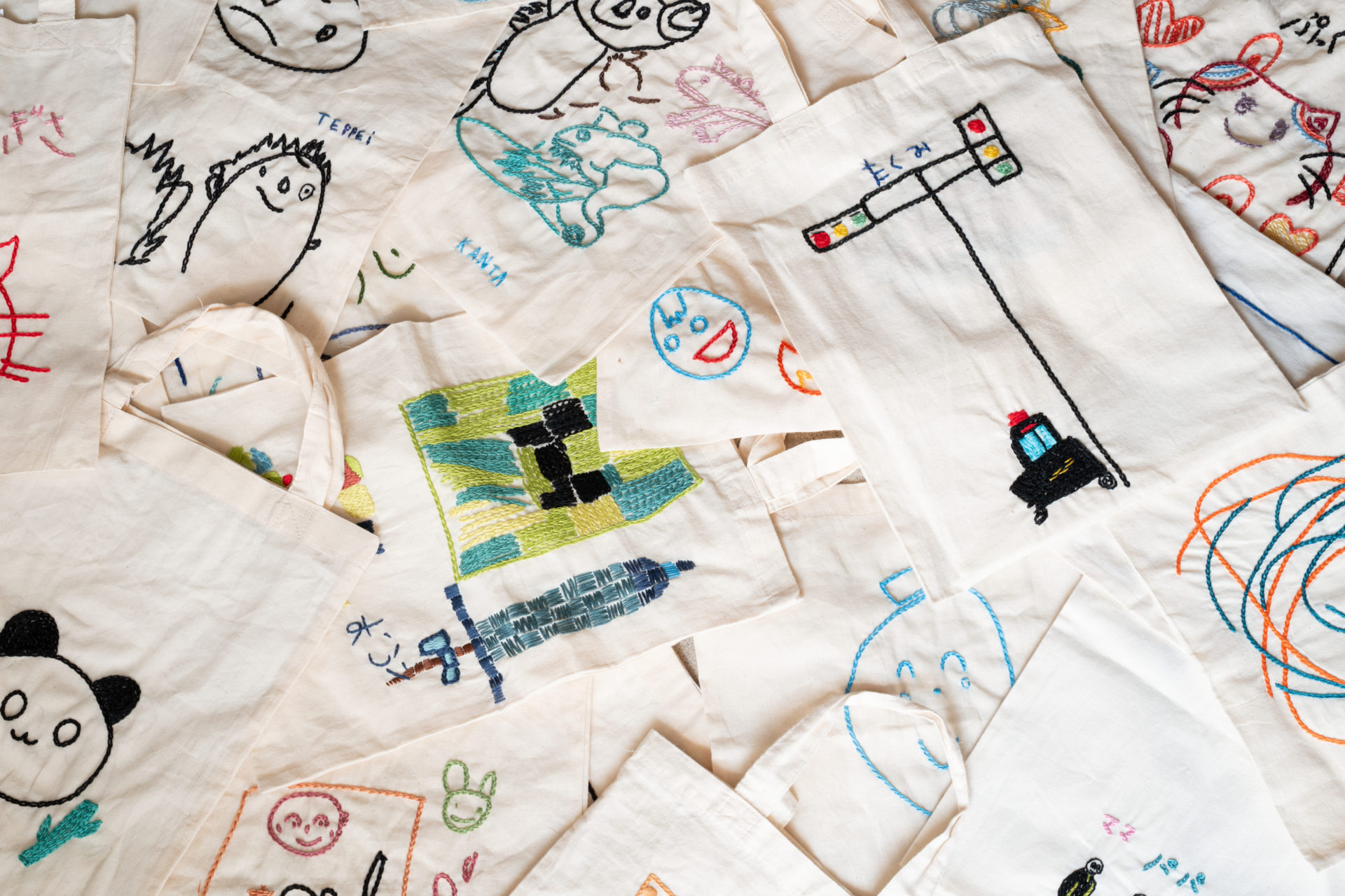 髙知子さんが取り組む「ミームプロジェクト」は、令和6年能登半島地震の被災地域に住む子どもたちがトートバッグに描いた絵を、髙さんが刺繍にして贈り返すというプロジェクトです。このプロジェクトのオマージュとして、展示会場内にて無地のトートバックに自分で絵を描いたり、刺繍を施したりすることができる体験コーナーを設けています。GO FOR KOGEIの思い出に、世界にひとつだけのトートバックを作ってみてはいかがでしょうか。